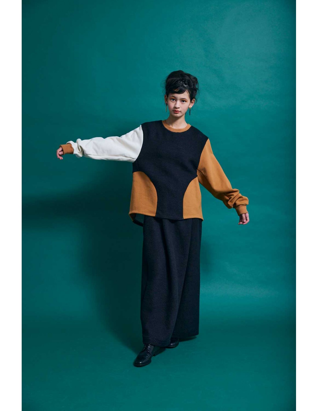 表面がフェルトのような質感のウール混の生地を使用した男女兼用で履いていただけるワイドレッグパンツ。