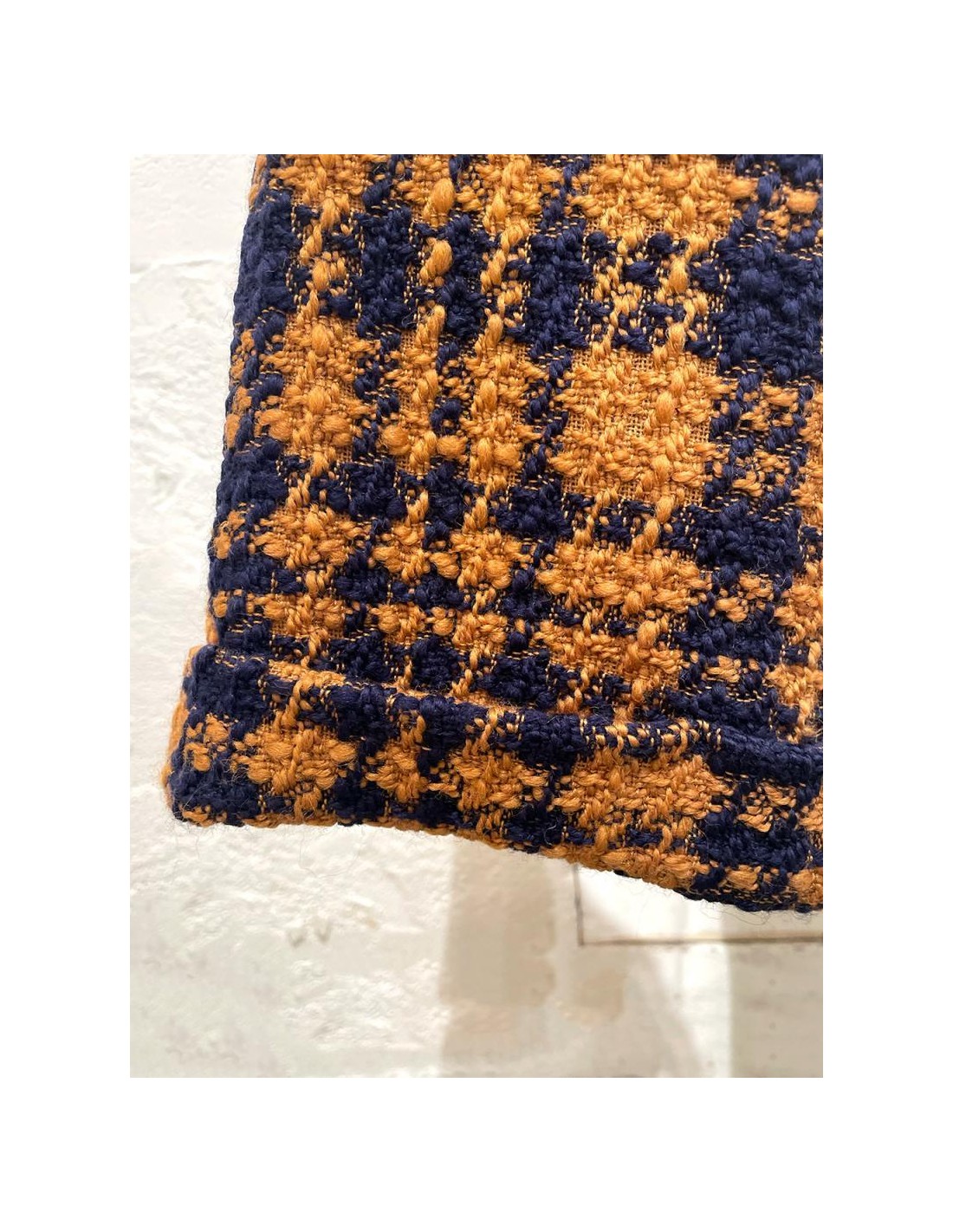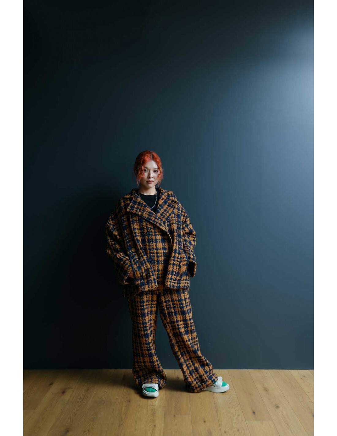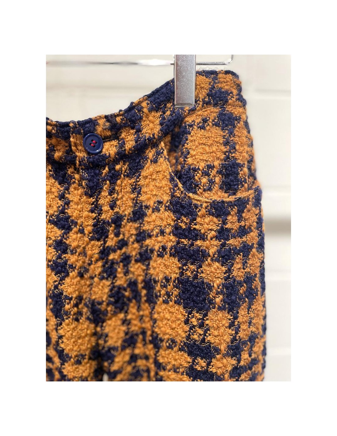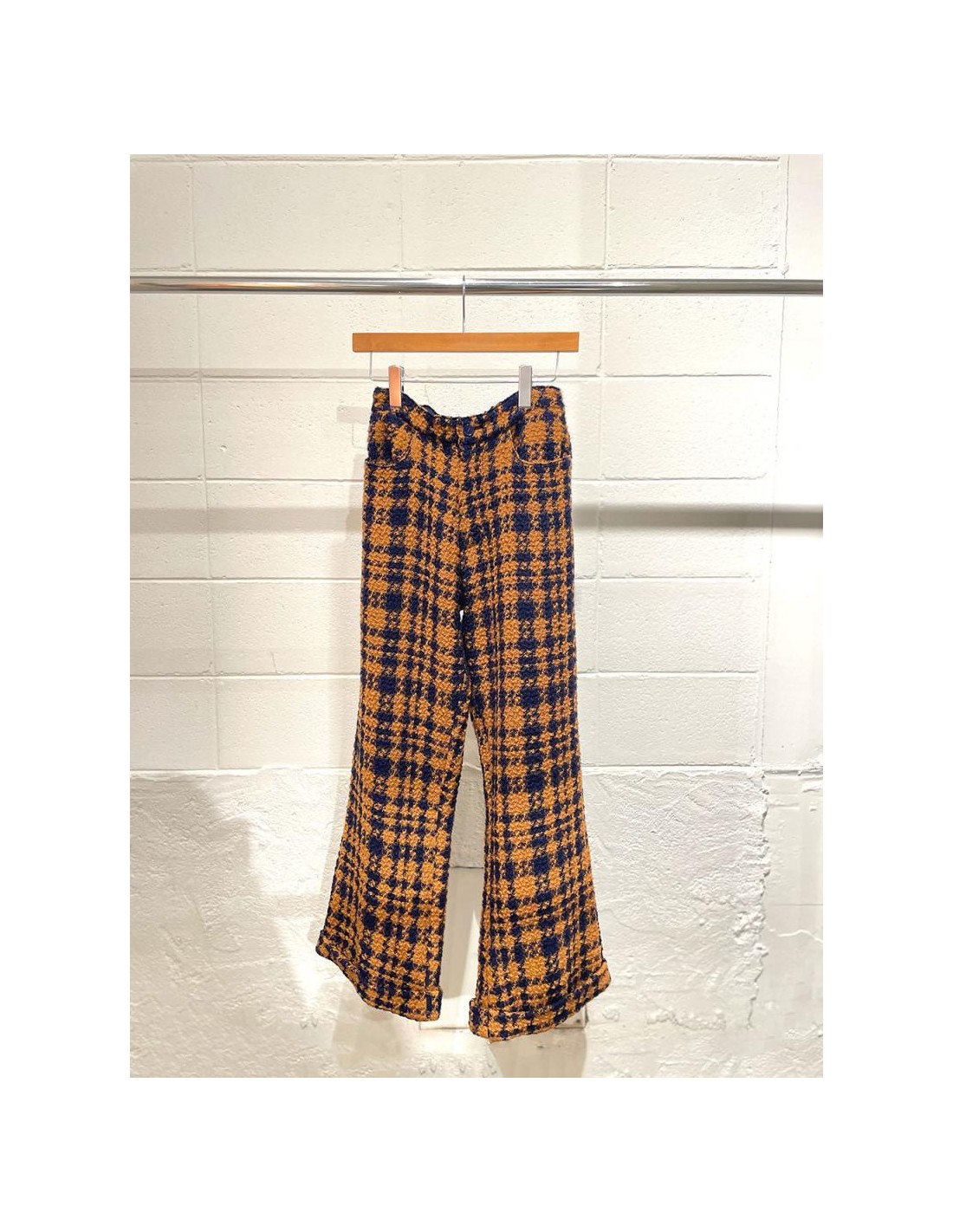 色合わせがかわいい千鳥柄のウール混の生地を全面に使用したこちらのパンツは裾にむかって広がるオーバーサイズのワイドパンツ。