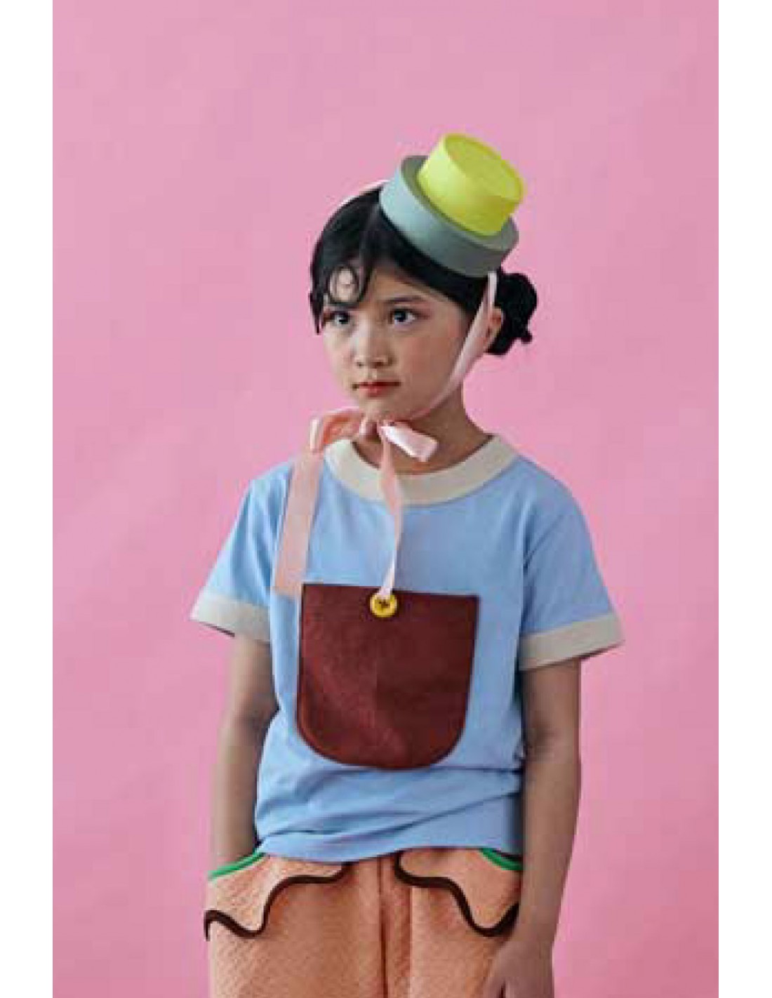 ヨーロッパ古着を思い出すような色の組み合わせで前身頃に大胆に大きなポケットを付けた男女兼用のTシャツです。