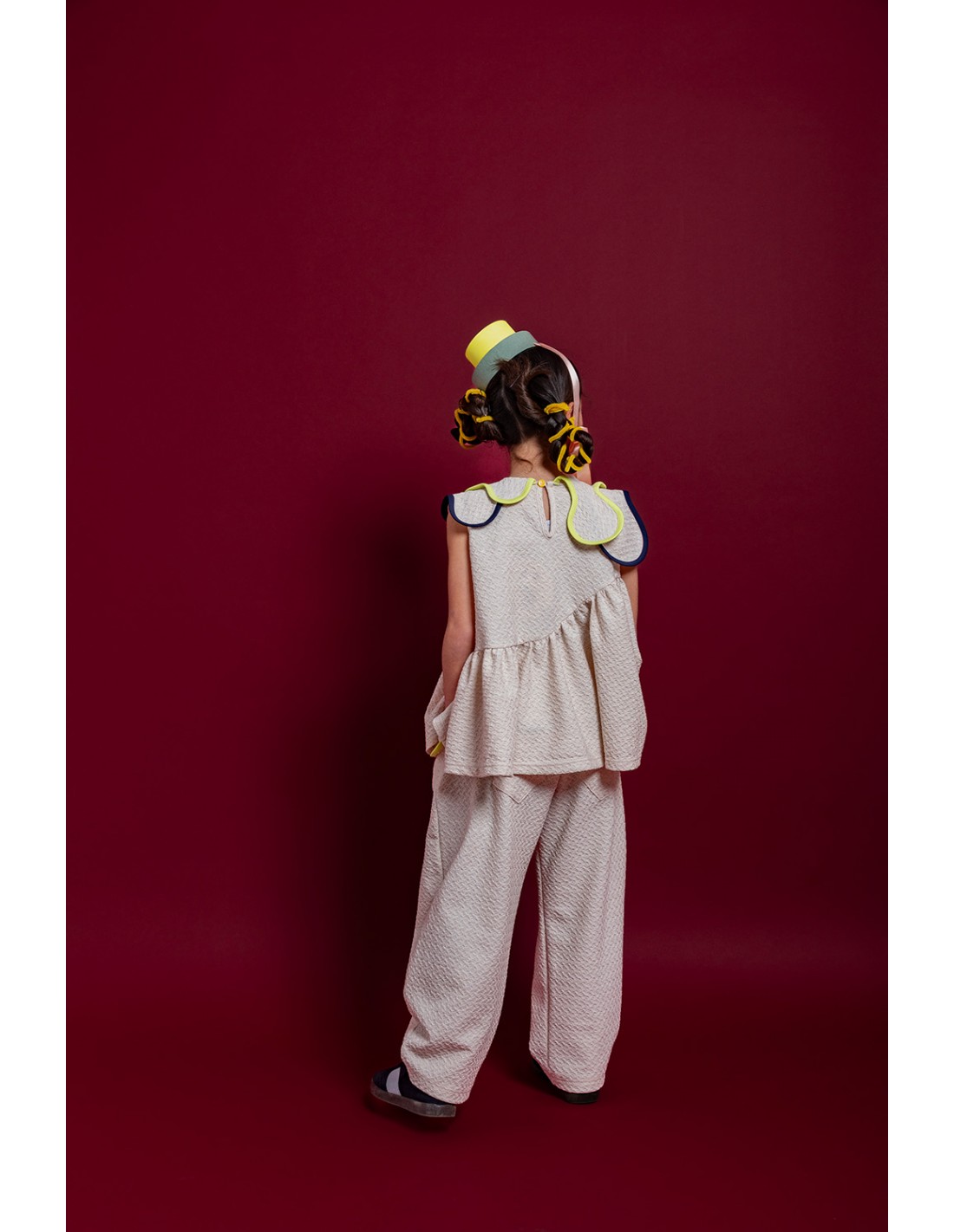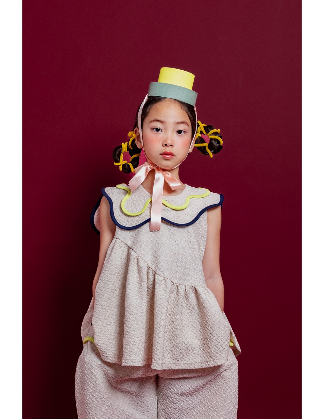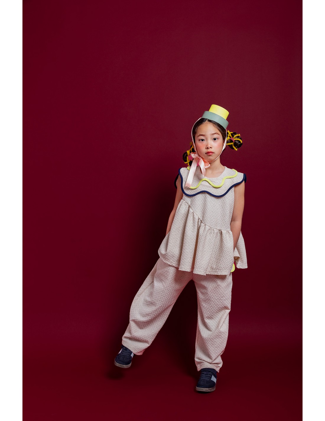溶けだすアイスクリームのフォームをイメージした大き目の襟に配色がかわいいパイピング。